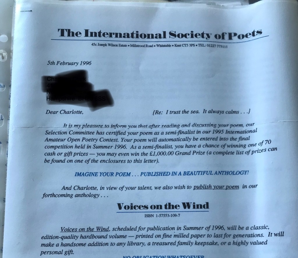 In the folder you see above, I keep some early writing attempts and English schoolwork. I can never throw any of this away as it’s too precious to me. It covers about ten years of work, from English assignments to poetry publishing letters. It begins from the age of 14, through to 1999. And I thought I would share some of these with you.