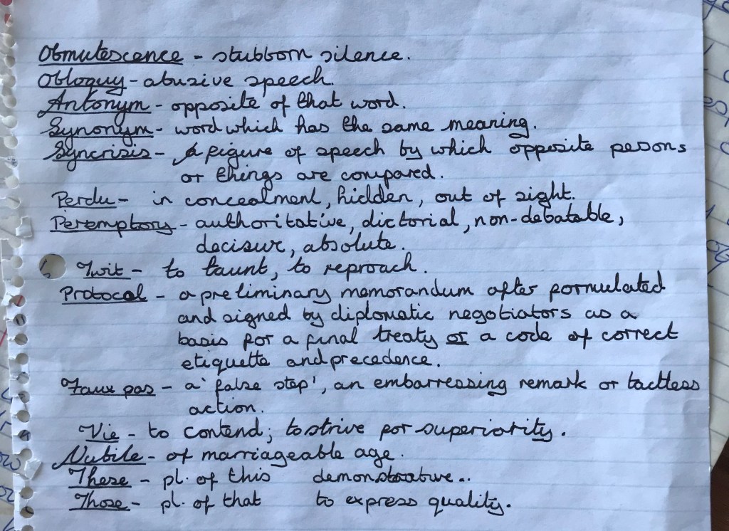 I’ve always enjoyed learning new words. When I used to read in the evening, I always kept a dictionary nearby so I could look up anything I didn’t know. The following photo shows a list of words that I found interesting.